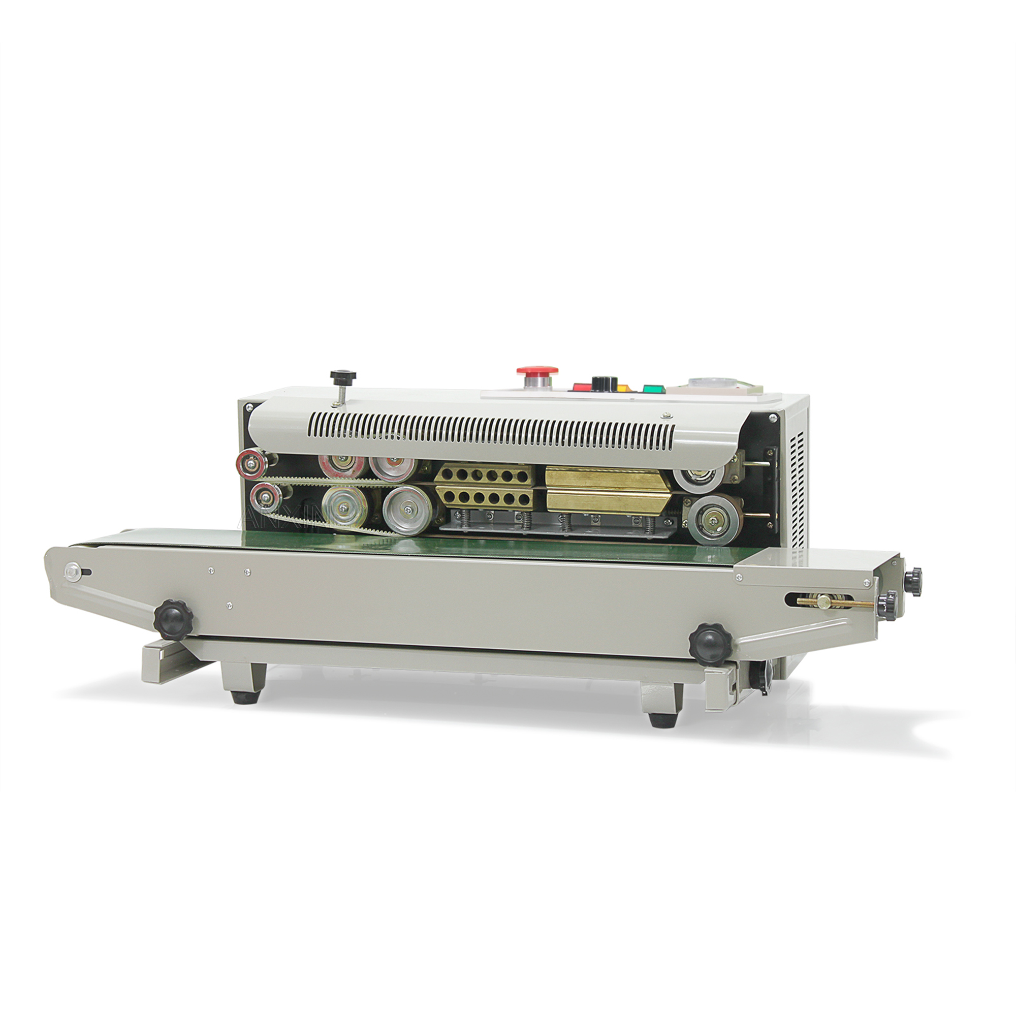 The CFR-900V continuous sealer is designed for small bags and uses smart sealing technology. It has electronic temperature control and adjustable speed. It works with many types of plastic films and even has a built-in embosser to print dates, saving time. You can set it up vertically for liquids or horizontally for dry goods like powders.