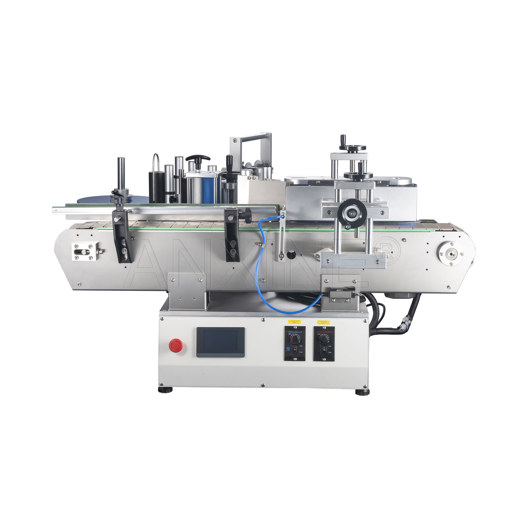 • Control de velocidad independiente: Perillas separadas para ajustar la velocidad de la cinta transportadora y del rollo de etiquetas.