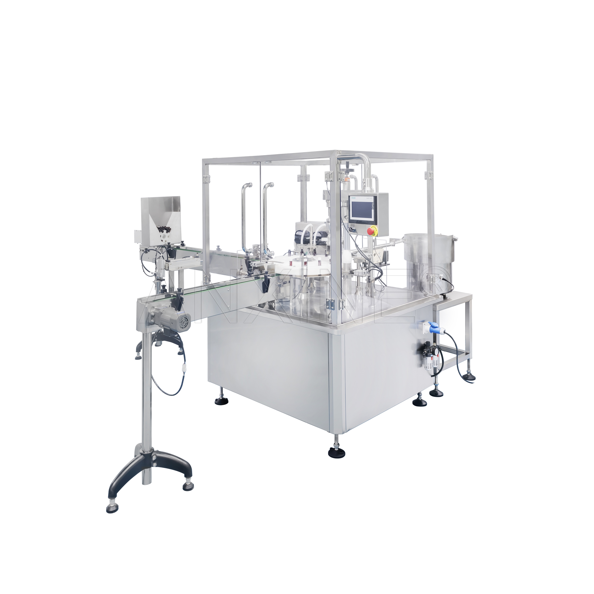 Durante la operación, la máquina comienza organizando las botellas vacías y colocándolas en posición vertical. Las mueve una a una mediante una plataforma giratoria. La bomba peristáltica llena cada botella con una cantidad precisa de líquido. Esta bomba es precisa para dosis pequeñas. Si detecta que falta una botella, omite el llenado para evitar derrames. Luego, las botellas avanzan a la estación de tapado. Las tapas se presionan suavemente y se enroscan firmemente. Finalmente, los productos completos se envían para su procesamiento posterior.