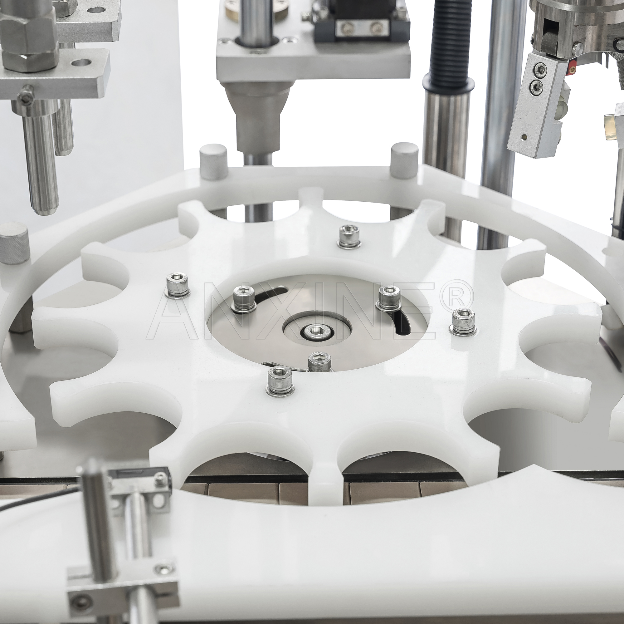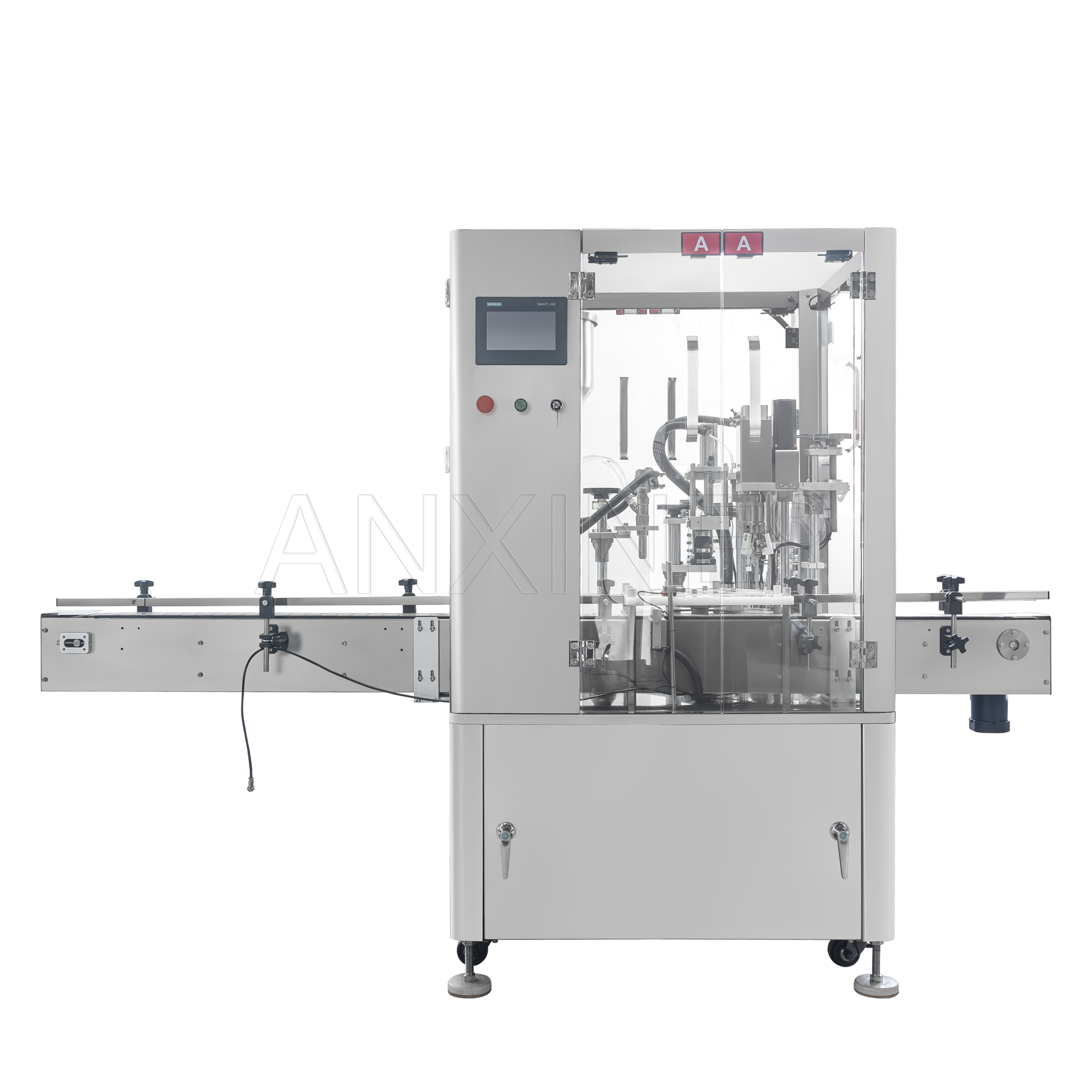 Esta máquina está diseñada para líquidos de baja viscosidad como sueros, tinturas o gotas oftálmicas. Su sistema controlado por PLC ayuda a evitar desperdicios. Además, la cabeza de tapado ajustable se adapta a distintos tamaños de botellas con cuentagotas. Gracias a su diseño compacto, el modelo se integra fácilmente en laboratorios o fábricas.