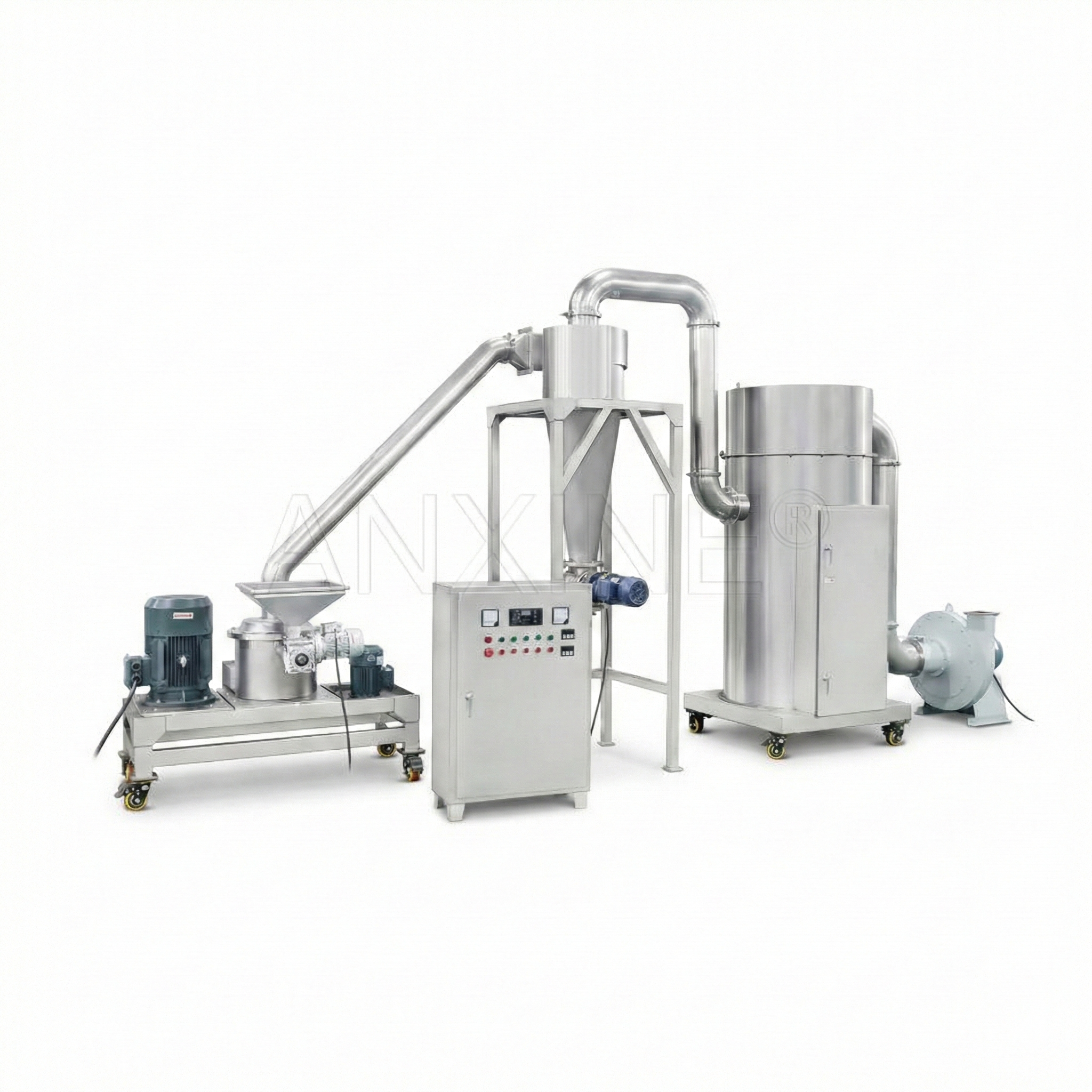This powder grinding is built for ultra-fine, precise grinding of dry materials. It’s specially designed for industries like pharmaceuticals, food, and chemicals where particle size control is critical. This machine uses a combination of air separation, strong shear, and pressure grinding to turn materials into fine powders. Materials are fed into the grinding chamber by an auger conveyor. Then they are processed by high-speed blades that crush and shear them into ultra-fine particles.