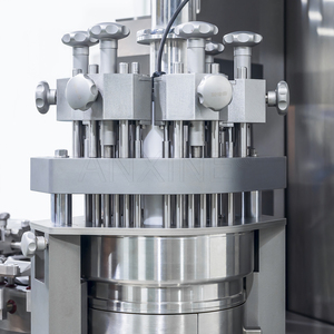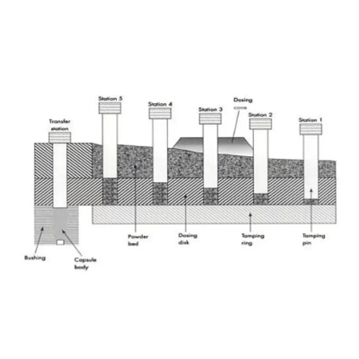 It uses a rotating dosing disc and several tamping pins to fill capsules. It fills capsules through step-by-step powder compaction. At first, powder flows into the dosing disc. A series of tamping pins then compresses the powder inside the disc holes in multiple stages. This process forms a compact powder slug with the preset depth as required.