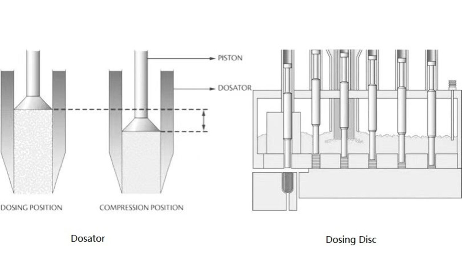 - Dosing disc (tamping pin) principle: Uses a rotating disc with cavities and a series of pins to gradually compress powder into a solid slug, which is then ejected into the capsule body.