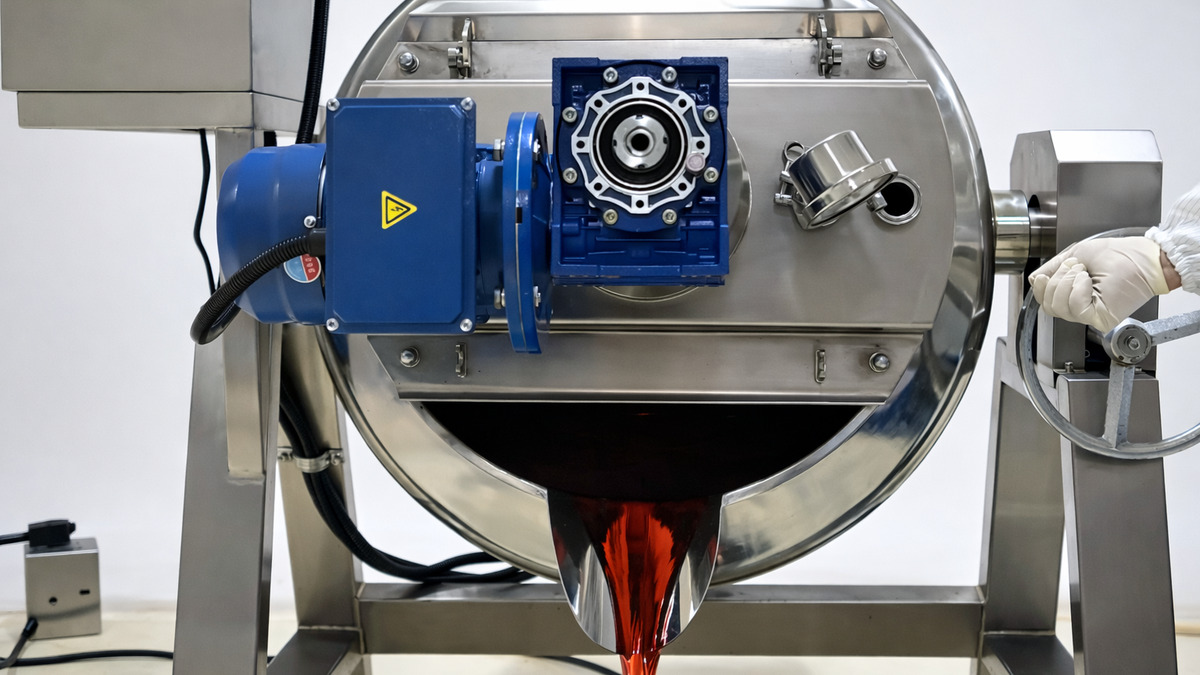 Step 3: Once the slurry is cooked and mixed, remove the cooker lid. Rotate the side handwheel to tilt the kettle. Pour the hot slurry into a transfer bucket.