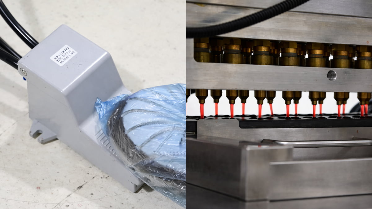 Step 6: Place an empty mold onto the metal track beneath the depositing nozzles. Slide it into position.