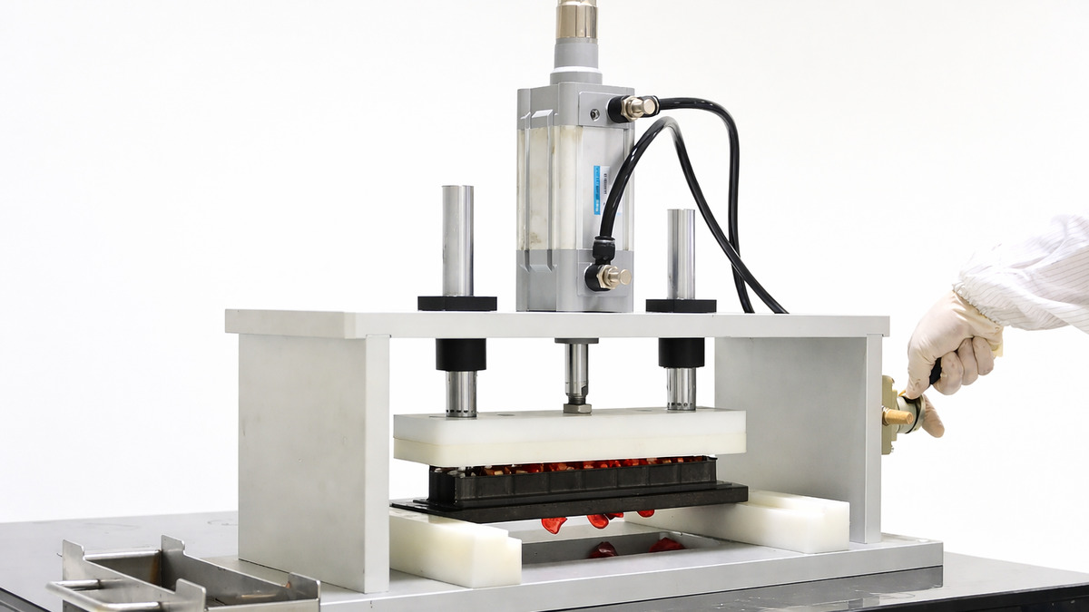 Step 9: Pull the manual lever on the side to engage the pneumatic cylinder. The ejection plate descends and pushes ejector pins through the back of the mold to release the finished gummies.