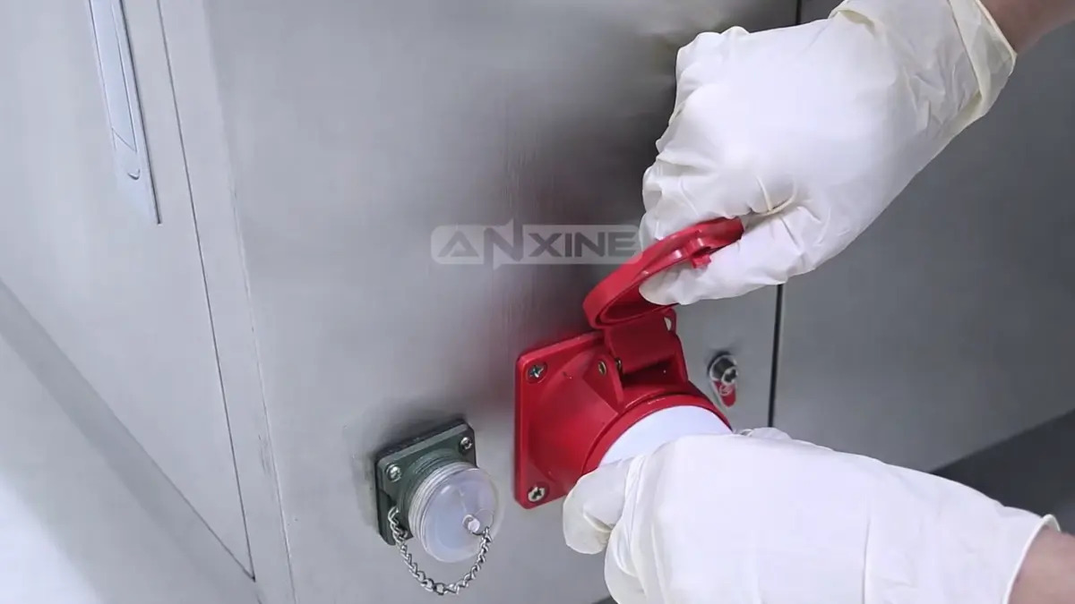 Step 1: Plug the industrial power cable into the large red socket located on the side of the machine.