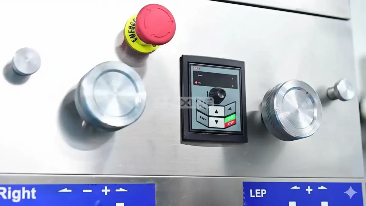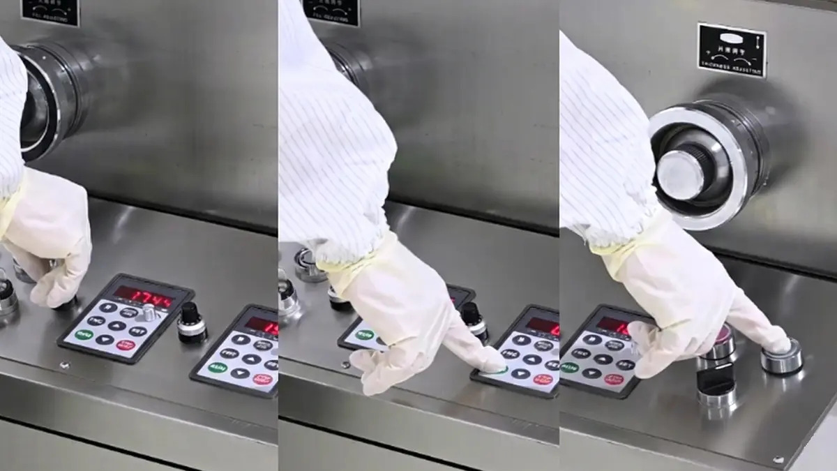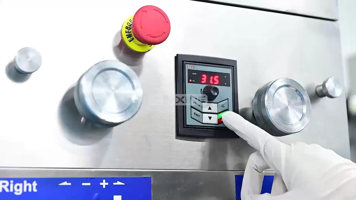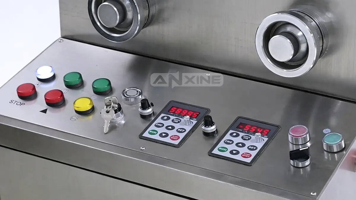 Step 2: Power on the system. The control panel lights up. Adjust the Left and Right handwheels to set the tablet thickness and filling depth.