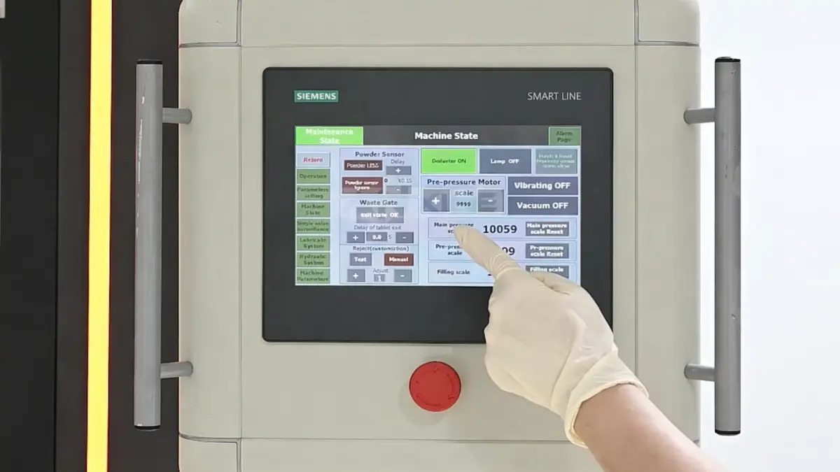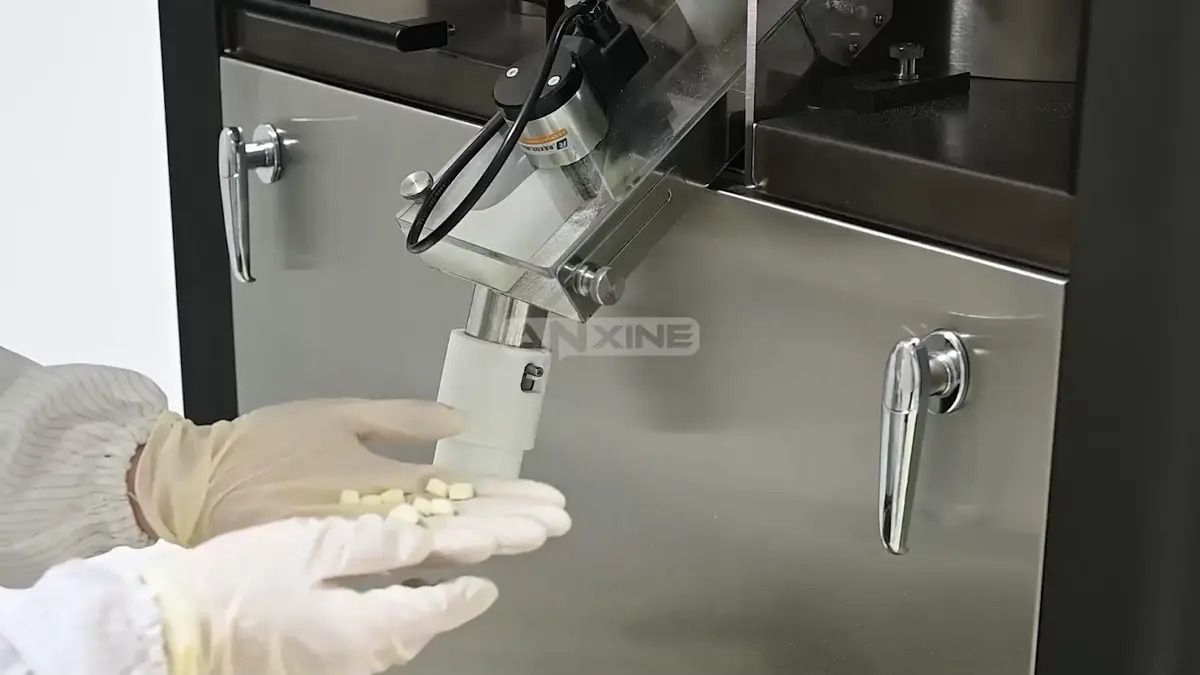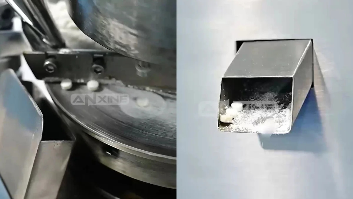 Step 5: Inspect the finished tablets that exit through the discharge chute. Defective ones are rejected at the same time.