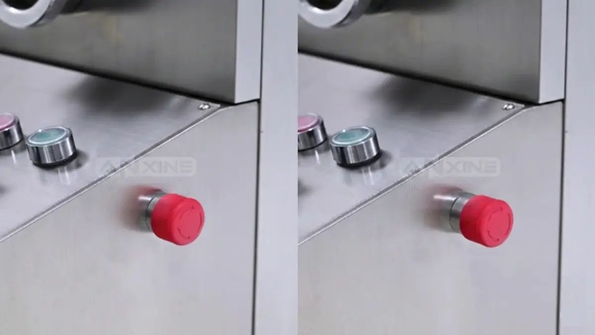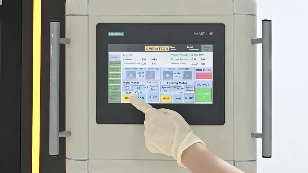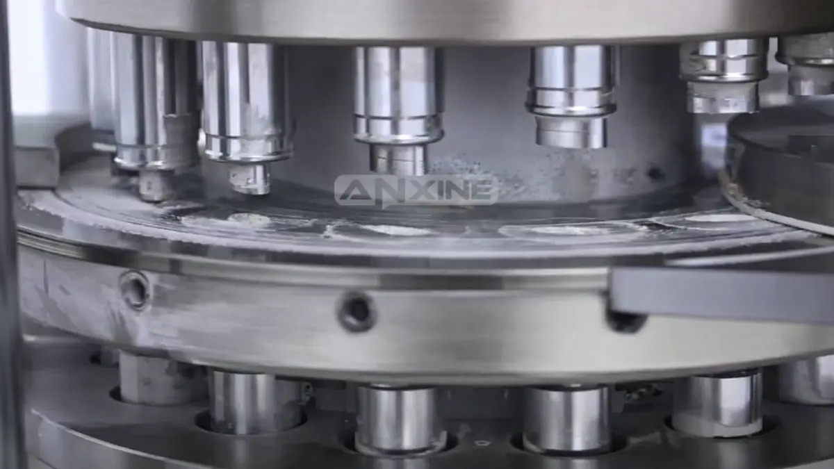 Step 6: Once the settings are confirmed, the machine begins working. The upper and lower punches move vertically to compress the powder within the die.