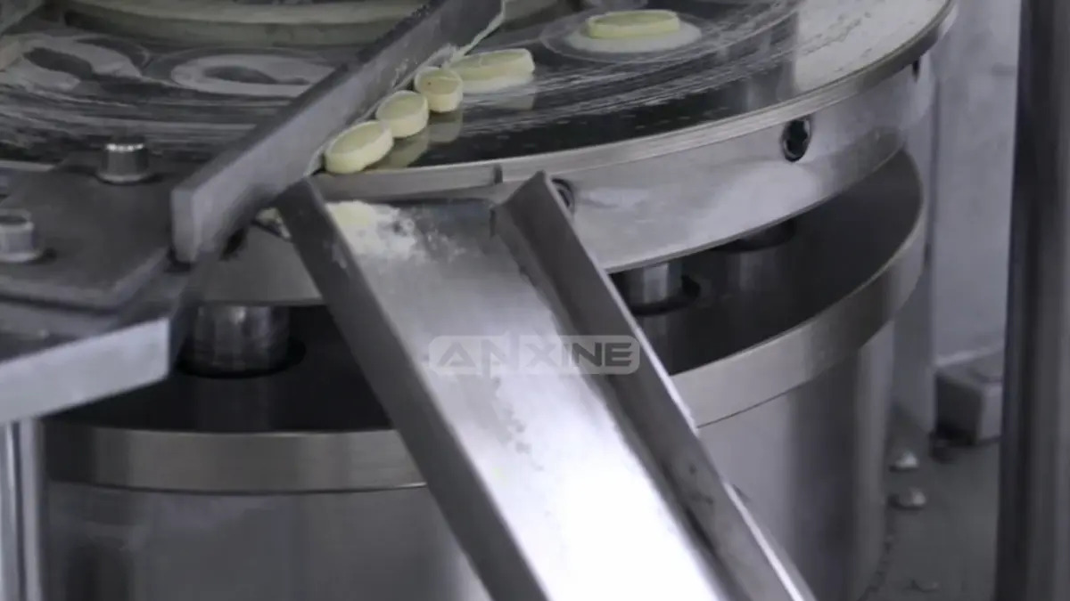 Step 4: Formed tablets are ejected and guided by the take-off blade to the discharge chute. Press STOP to halt the machine.