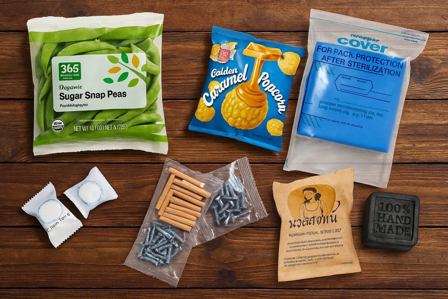 Hardware & Electronics: Small hardware items are often sold in pillow bags with a label. It keeps the pieces together and is cheaper than boxing them. Similarly, cables, adapters, earbuds, and other small electronics accessories sometimes come in simple pillow-style plastic bags, especially when sold online or as spare parts.