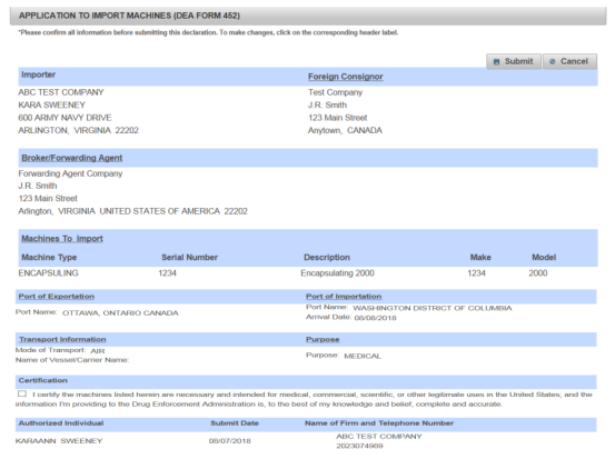 - Advance notice to the DEA. If you plan to import or export, submit the DEA Form 452 at least 15 days before the machines arrive at the port.
