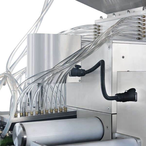 The feeding system mainly includes the hopper, pump, and pipes. It delivers the liquid or semi-liquid material into the capsule. The pump controls the filling volume, so each capsule has a consistent dose. It also allows adjustment when the product weight needs to change. In addition, there are dosing nozzles. They deliver the exact volume of fill into the die pockets. The internal diameter and design must match the viscosity and required fill weight.