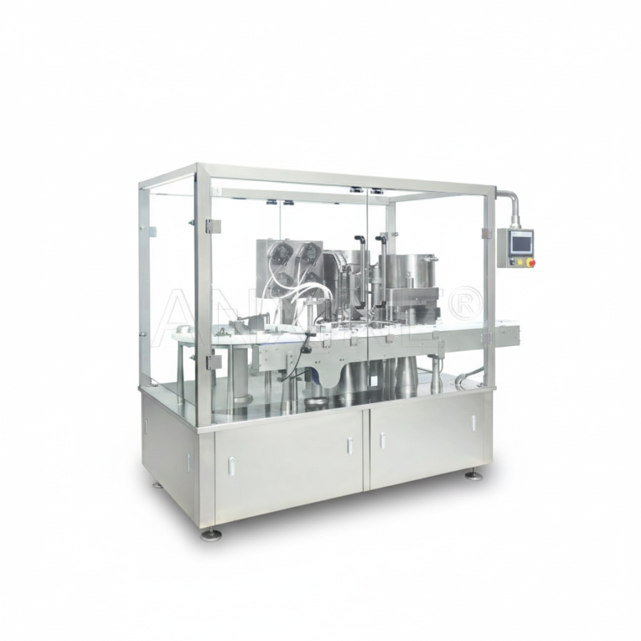 - Высокоскоростная автоматизация. Обрабатывает 100–120 флаконов в минуту за один цикл. Автоматизирует весь процесс от наполнения до укупорки.